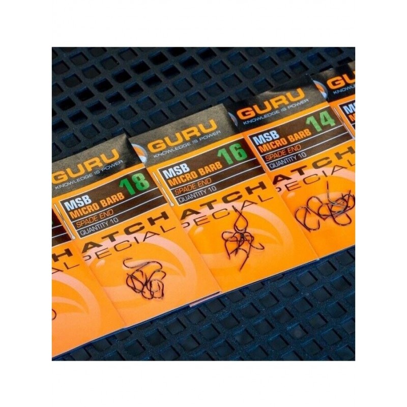 Kabliukai GURU MATCH SPECIAL - skirti žvejybai pludine ir dugnine meškere. Su mikro užkarpėle. Specialaus lenkimo. Šie kabliukai giriami žvejų profesionalų forumuose. Tvirtinimas prie valo - lopetėlė. Pakuotėje 10 vnt. Spalva - tamsi bronzinė.