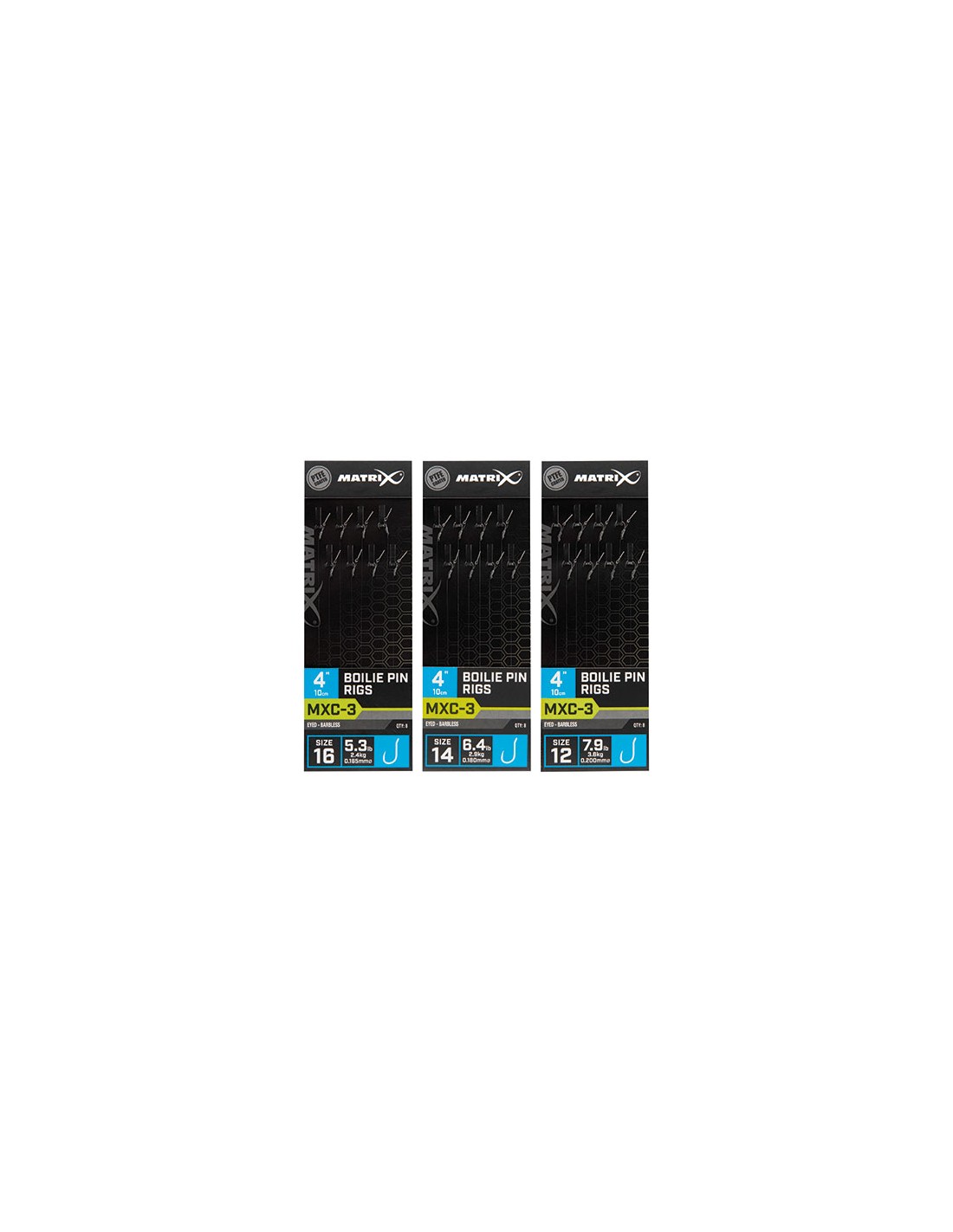 Kabliukai Matrix MXC-3 Boilie Pin Rigs - skirti gaudymui "Method" būdu. Paruošti naudojimui, su plauko (bayonete - metalinis kiliukas) sistema. Pavadėliai - 4' (10 cm) ilgio. Kabliukai be užkarpėlės - Barbless. Pakuotėje - 8 vnt.