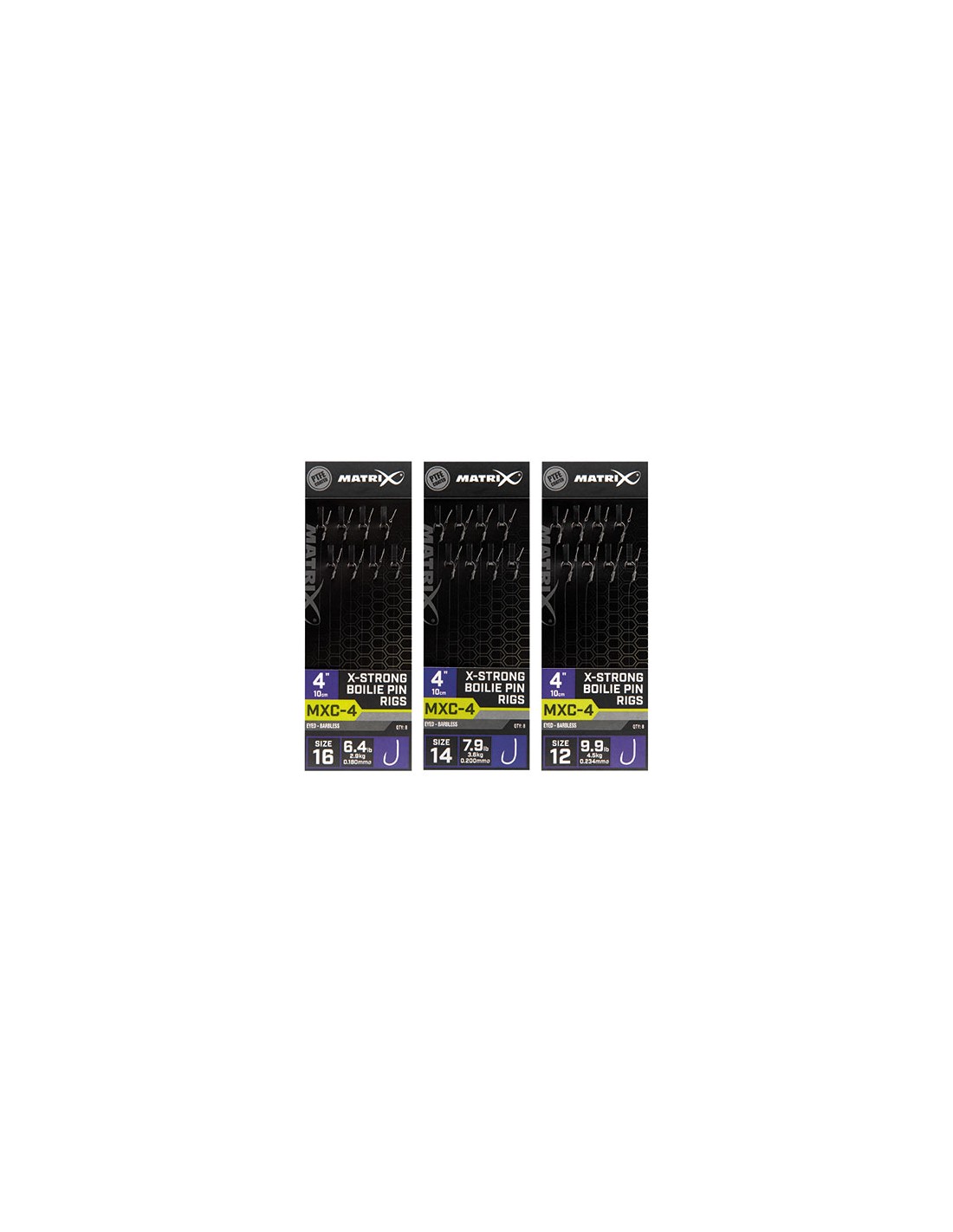Kabliukai Matrix MXC-4 X-Strong Boilie Pin Rigs, 4'' - skirti gaudymui "Method" būdu. Paruošti naudojimui, su plauko (bayonete - metalinis kiliukas) sistema. Pavadėliai - 4' (10 cm) ilgio. Kabliukai be užkarpėlės - Barbless. Pakuotėje - 8 vnt.