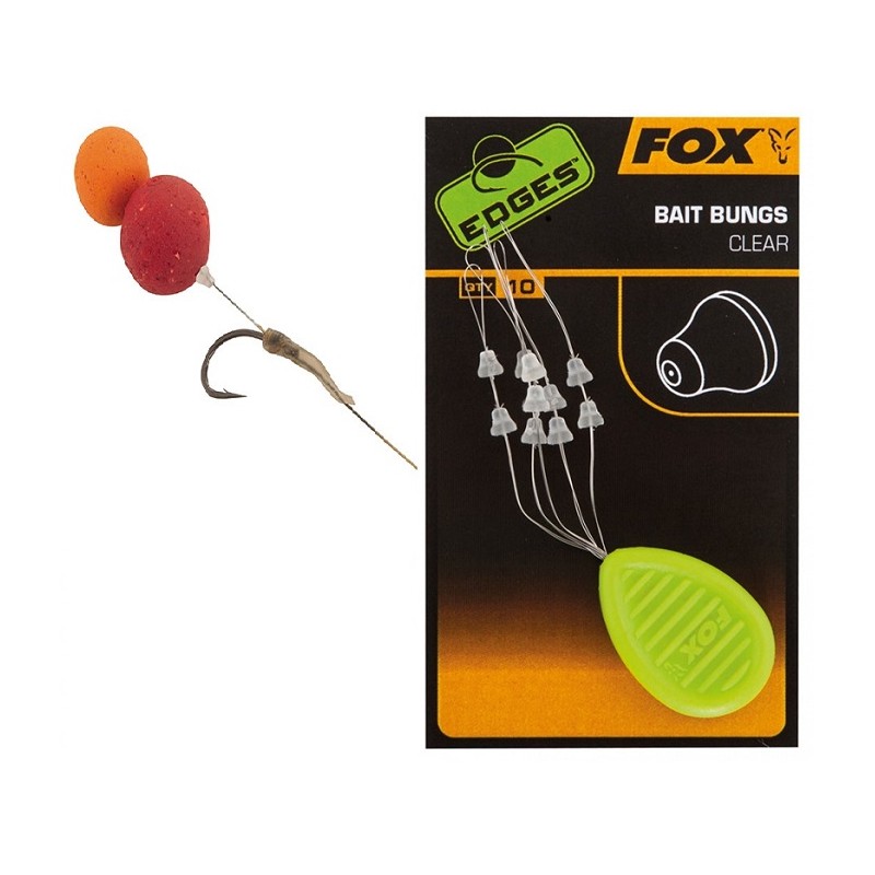 FOX masalo fiksatoriai EDGES™ Bait Bungs - skirtas boilio, paletės/kito masalo fiksacijai žvejojant plauko sistema - neleidžia masalui nuslysti link kabliuko. Spalva - skaidri. Kiekis pakuotėje - 10 vnt.