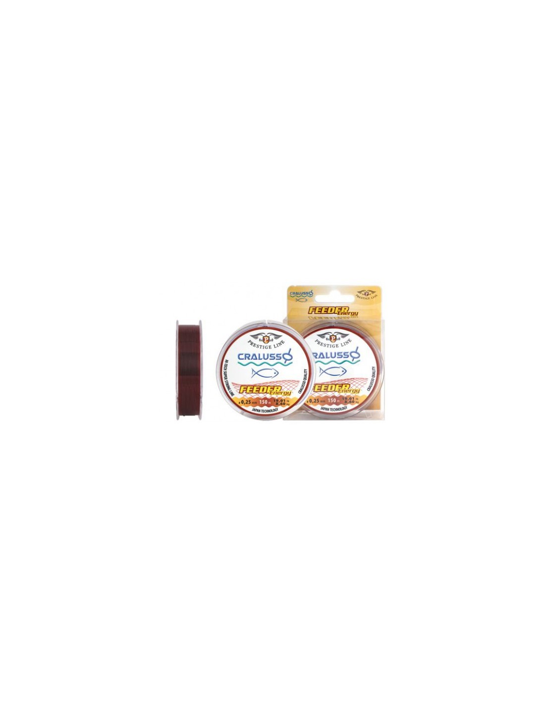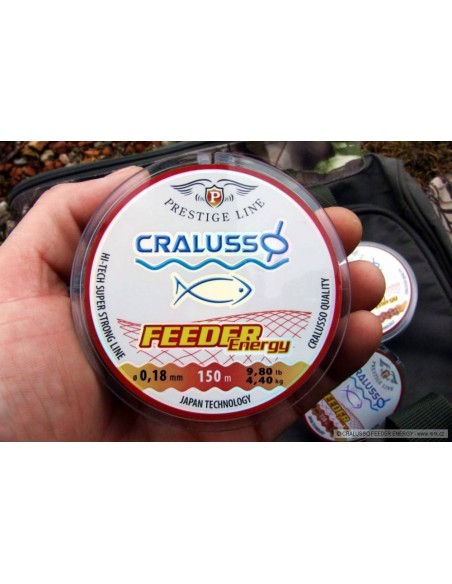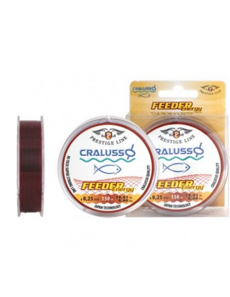 Skęstantis monofilamentinis valas Cralusso Feeder Energy, 150m - monofilamentinis skęstantis valas fideriui, patogus rišti šoklyderiam arba naudoti kaip įprastą mono valą. Rudos spalvos, todėl vandenyje beveik nematomas, gerai laiko mazgus, ilgaamžis. Ilgis 150m.